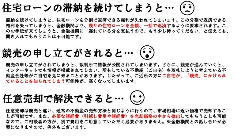 任意売却では競売と違い、適切な価格で売却が出来る事やプライバシーを守れる事、また、引越代がもらえるといったメリットがあります。